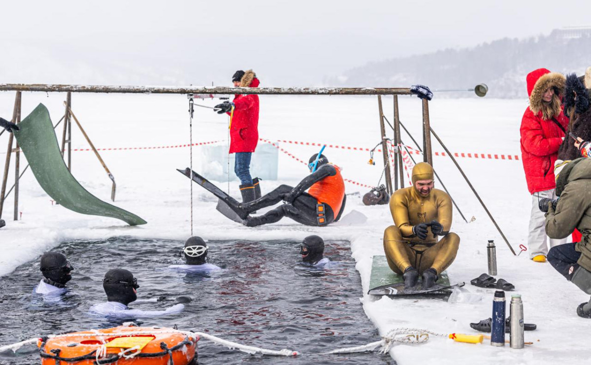 Спортсмены погружались в воду в экстремальных погодных условиях — температура воды держалась около +2°C, а воздух остывал до −20°C.